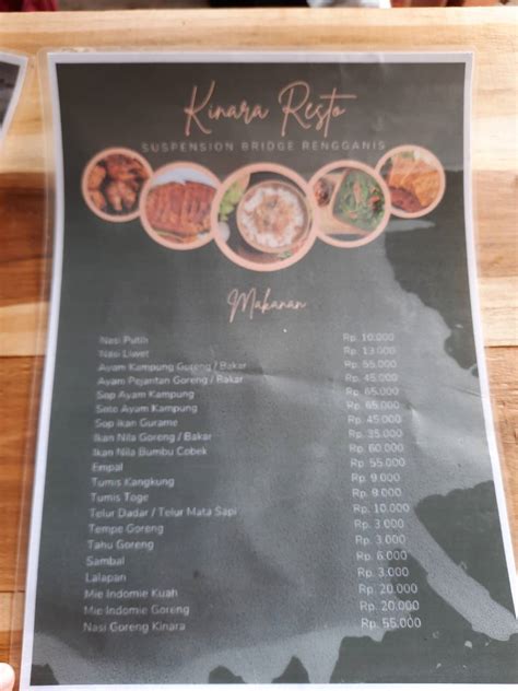 Restoran Kinara memiliki menu yang sangat beragam, mulai dari hidangan laut segar hingga masakan tradisional Indonesia. Menu ini disusun dengan baik dan mudah dipahami oleh pelanggan. Setiap hidangan dilengkapi dengan deskripsi singkat dan harga yang jelas. Menu ini juga dilengkapi dengan gambar-gambar yang menarik, sehingga dapat membuat pelanggan tertarik untuk mencoba hidangan tersebut.